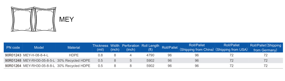 | Series | Materiel M | Thickness T (um) | Width W(cm) | Perforation length L(cm) | Printing P | Film Unit | Film Length/Unit (m) | Roll or case/pallet | Pallet size (mm) |